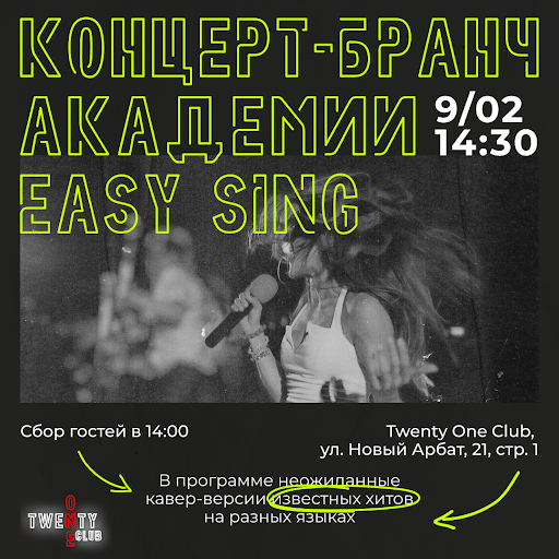• Выступление Ники Лазаренко-Зайковой, педагогов и студентов Академии Easy Sing. • Неожиданные каверы на любимые хиты на разных языках (будет красиво, обещаем!). • Живой звук и невероятная атмосфера. • Скидки до 75% на обучение для всех зрителей!